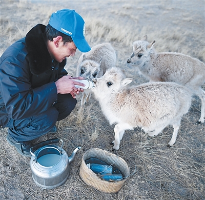 提升生态系统质量和稳定性 青海三江源国家公园管理局长江源园区可可西里管理处索南达杰保护站,巡山队员给被救助的藏羚羊幼仔喂奶。 新华社记者 张宏祥摄