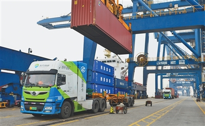 加快发展方式绿色转型 浙江嘉兴立足氢能源领域资源优势,持续拓展氢能示范“应用链”。图为嘉兴港乍浦港区,氢能重卡在集装箱码头运输作业。 人民日报记者 陈 斌摄