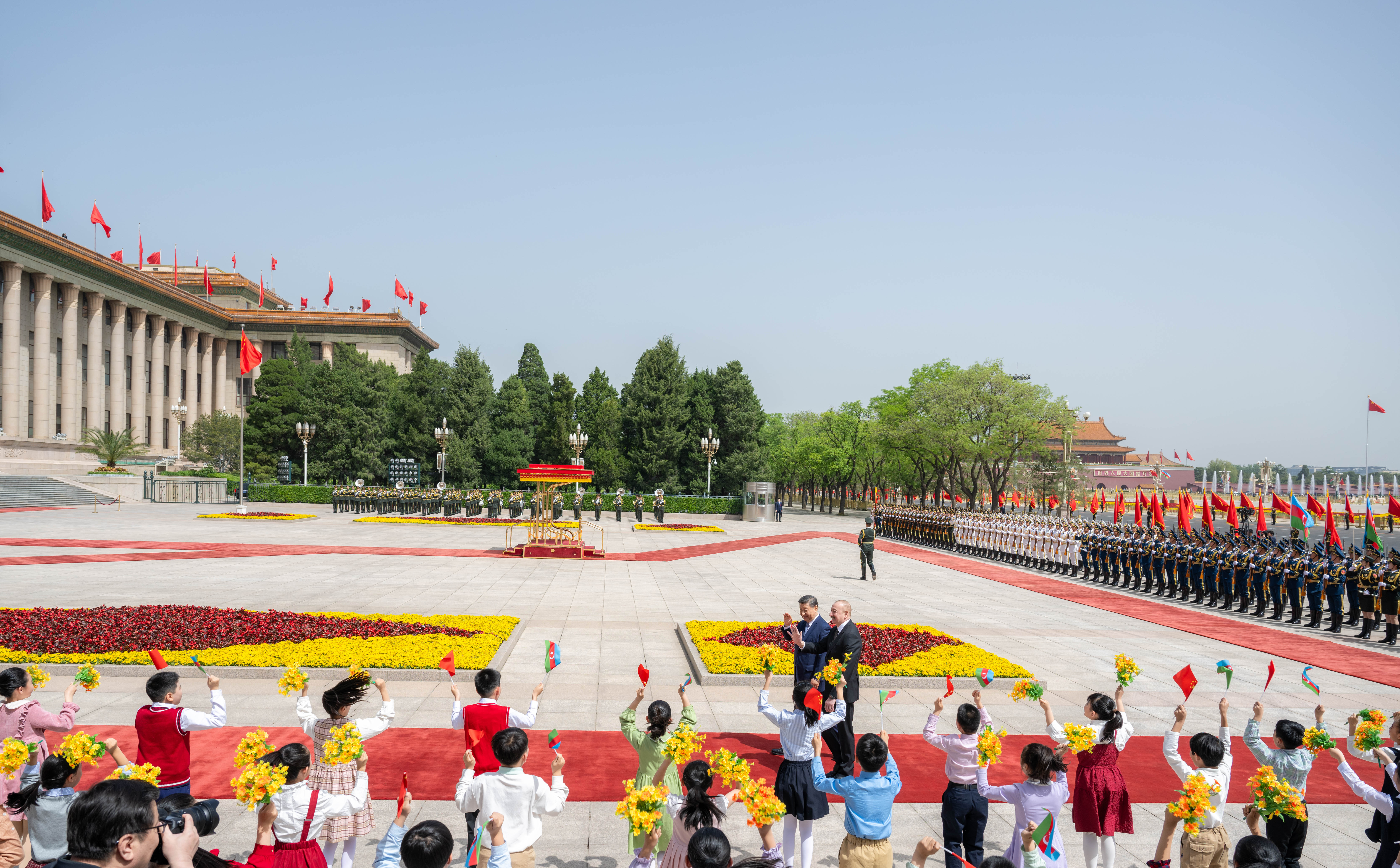 4月23日上午,国家主席习近平在北京人民大会堂同来华进行国事访问的阿塞拜疆总统阿利耶夫举行会谈。这是会谈前,习近平在人民大会堂东门外广场为阿利耶夫举行欢迎仪式。新华社记者 翟健岚 摄