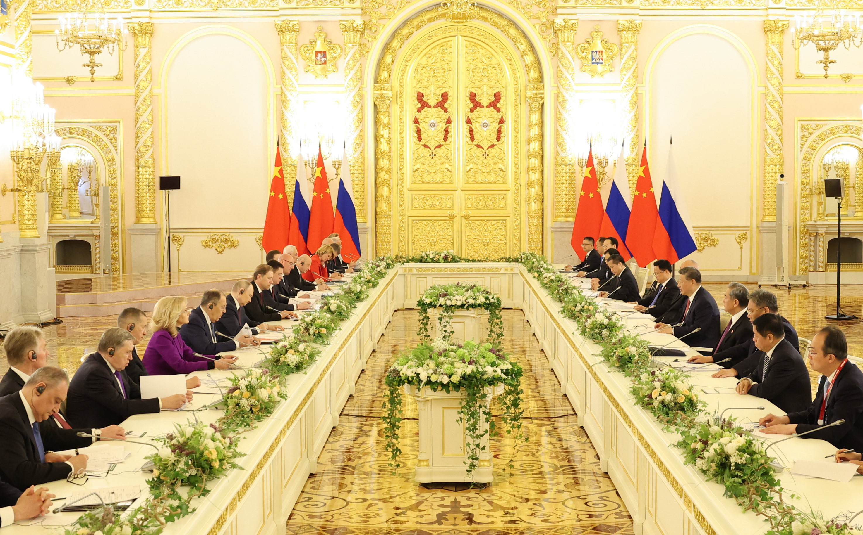 当地时间5月8日上午,俄罗斯总统普京同中国国家主席习近平在莫斯科克里姆林宫举行会谈。这是两国元首举行大范围会谈。新华社记者 姚大伟 摄